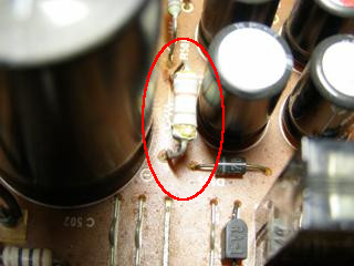 よくみると、パワー部と思われる抵抗が1部欠けている。(赤丸)またまわりの抵抗も全体の色がおかしい。