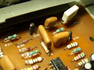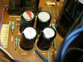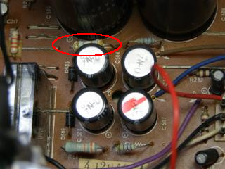左側のプリ部と思われるところの電解コンデンサーを取り外し、デジタル容量計とテスターで調べたところ怪しいコンデンサーがあった。たまたま手持ちで同じ規格のがあったので交換。赤丸のコンデンサ。