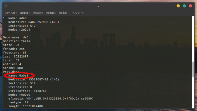 上のように表示される。16GBのUSBメモリーを挿しているのでProviderの2行目にMediasize 15521087488(14G)と表示されているので挿したUSBと思われる。