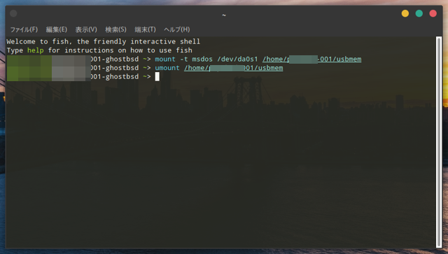 mountコマンドでマウントします。マウントする前にhomeフォルダーにマウントする際に使用するフォルダー(usbmemというフォルダー)を作成しました。MATE端末を立ち上げて"mount -t msdos dev/da0s1 /home/xxxxxxxx/usbmem"と入力します。(xxxxxxxxはユーザー名)