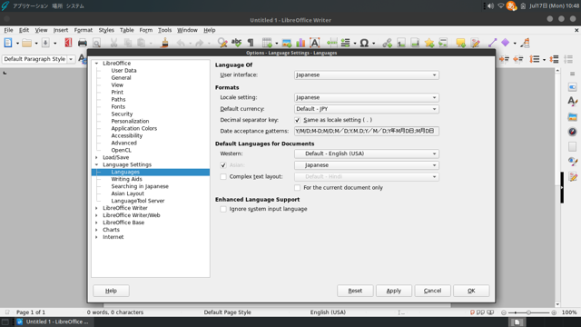[Tools]→[Option]→[Language Setting]→[Languages]を選択すると上の画面になり、openofficeと同じ画面が出てきた上の”Default English(UAS)"を”Japanese"にプルダウンで変更できれば。