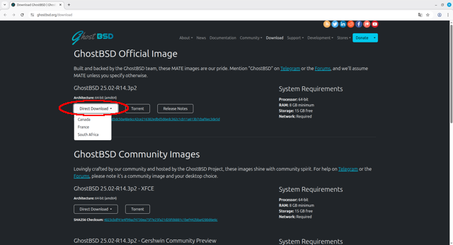 赤丸のDirect Downloadをクリックするとプルダウンでどこの国からと出るのでカナダを選択した。上でも書いてあるがダウンロードが完了するのに数時間かかった。