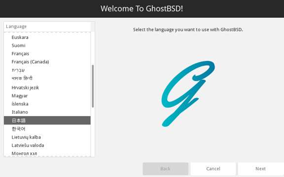「Welcome To GhostBSD!」の画面が表示され、"Language"を選択し[NEXT]。