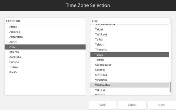 「Time Zone Selection」の画面が表示され、"Continent"と"City"を選択し[NEXT]。