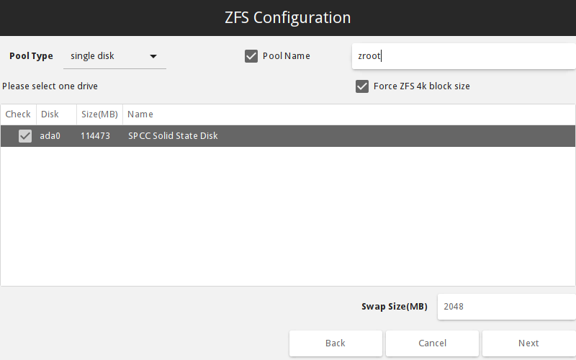 「ZFS Configuration」の画面が表示され、どのパーティションにインストールするかを選択し[NEXT]。
