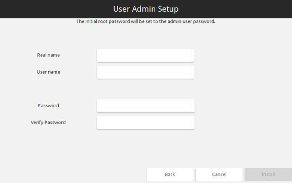 「User Admin Setup」の画面が表示され、"Real name"、"Username"、"Password"、"Verify Pasword"の設定を行う。
