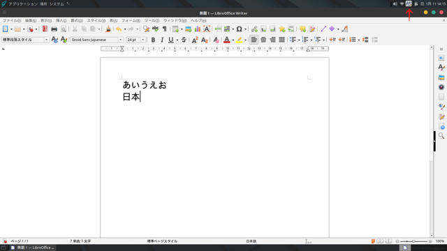 Libre Writerを開いて漢字キーを押下。右上に白い四角(赤矢印)が表示されれば日本語が入力できるようになります。
