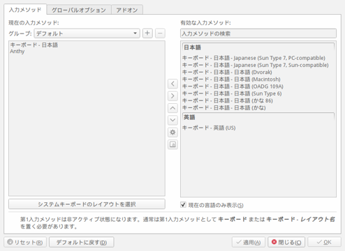 Fcitx5の設定画面を確認。左側にキーボード-日本語その下にAnthyと表示されています。これで、日本語が入力できるはずです。