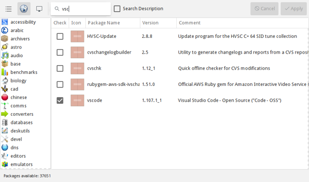 pythonを触りたのでVS CODEをインストールする。Software Stationからvscodeを検索。vscodeにチェックを入れて[Apply]