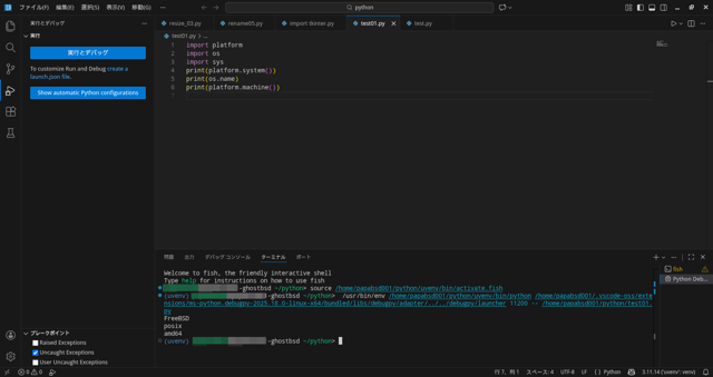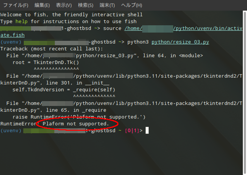 気になるのが、赤丸のPlaform not supportedのエラー内容だがネット上ではFreeBSDでTkinterdndは使用できるように出てくる。