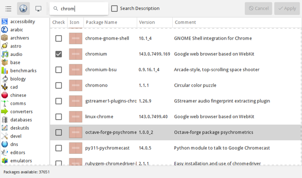 今度はchromで検索する。chromeの元と思われるchromiumがあったのでそれをインストールした。