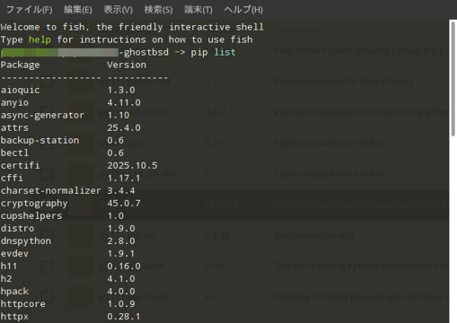 端末でpip listを入力するとインストールされているパッケージが表示された。