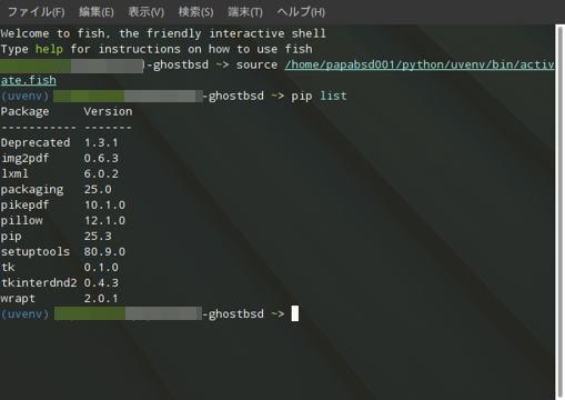 仮想環境を有効にする。(注)Ghostはactivateではなくactivate.fishにしないとエラーになる。
