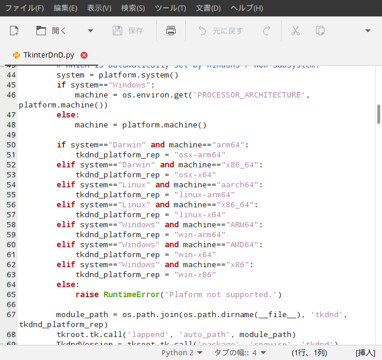 "python/uvenv/lib/python3.11/site-packages/tkinterdnd2/TkinterDnD.py"をPlumaで開いて65行目辺りを表示してみると、エラーで表示されている「raise RuntimeError('Plaform not supported.')」の記述がある。