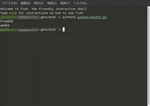 プログラムを作成してGhostBSDの値は何が返ってくるか調べたところ、systemはFreeBSD・machineはamd64が返ってきた。