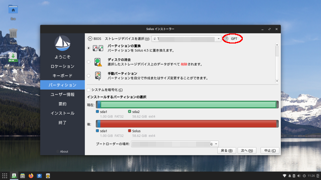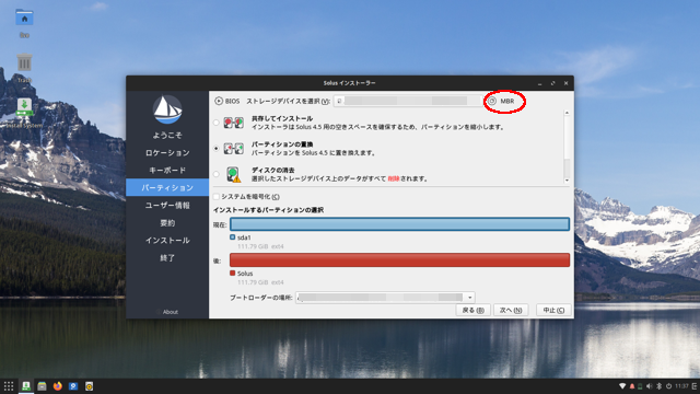 赤丸のところがMBRと表示された。このまま先に進んでインストール完了。再起動したところ立ち上がった。
