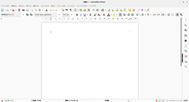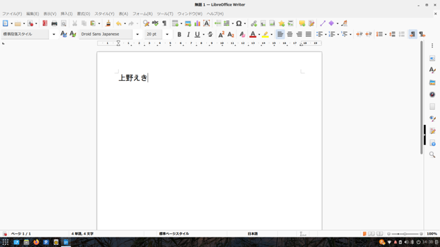 LibreOffice Writerを起動して確認。日本語表示されている。