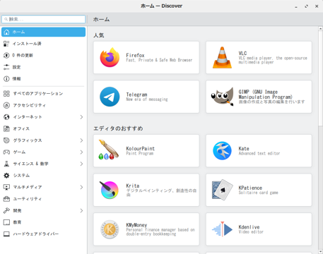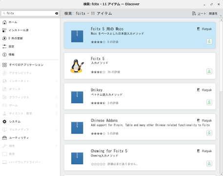 普段から使用している"Fcitx"、"Mozc"をインストールしてみます。パッケージのインストールはDiscoverを使います。ちなみにmintはソフトウェアマネージャーを使います。