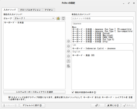 設定画面が出たが、左枠のキーボードの下にMozcが出てこない。LibreのWriterで日本語は立ち上がらなかった。