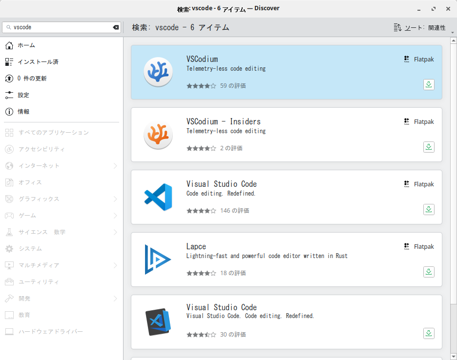 再度Discoverで検索するとインストールした2つ下にアイコンは違うがFlatpakではないVisual Studio Codeがあるのでこれをインストールした。