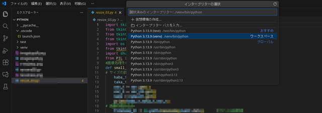 起動するとどこかで見たことがあるエラー画面が出てきたが、日本語表示できるようにしてpython for Visual Studio Codeをインストールする。自作のpythonソフトを実行するとtkinterがないとエラーが出る。端末でtkinterはインストールは確認している。
