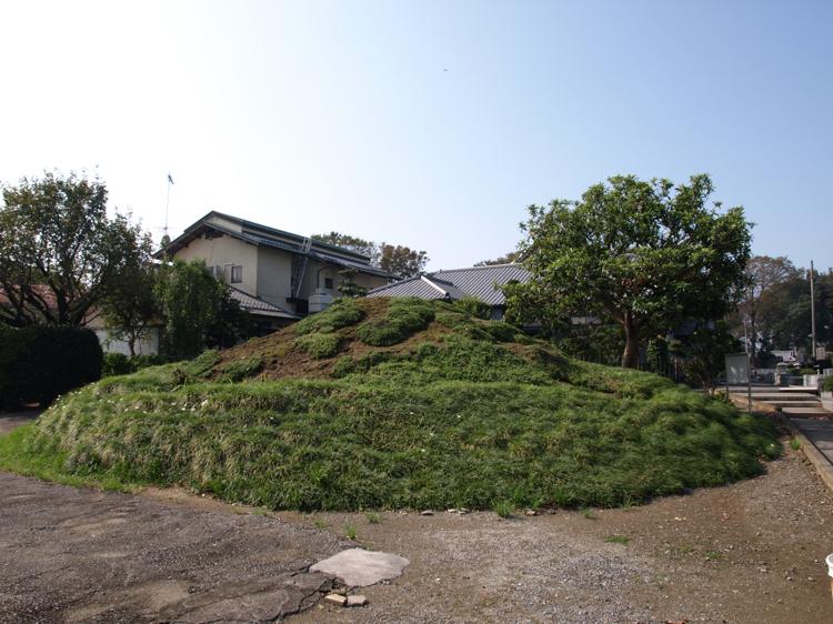 この塚は開山塚と呼ばれ東西13.5メートル、南北13メートル、高さ1.8メートルのよく原形が保たれた円墳である。昭和49年発掘調査が行われ墳丘主体部から歯4本・銅銭1枚・鉄クギが出土し、死者が葬られていたことが明らかになった。被葬者が誰であったかどうかは全く不明であるが、室町期の史料がほとんどない越谷市にとって貴重なものである。
